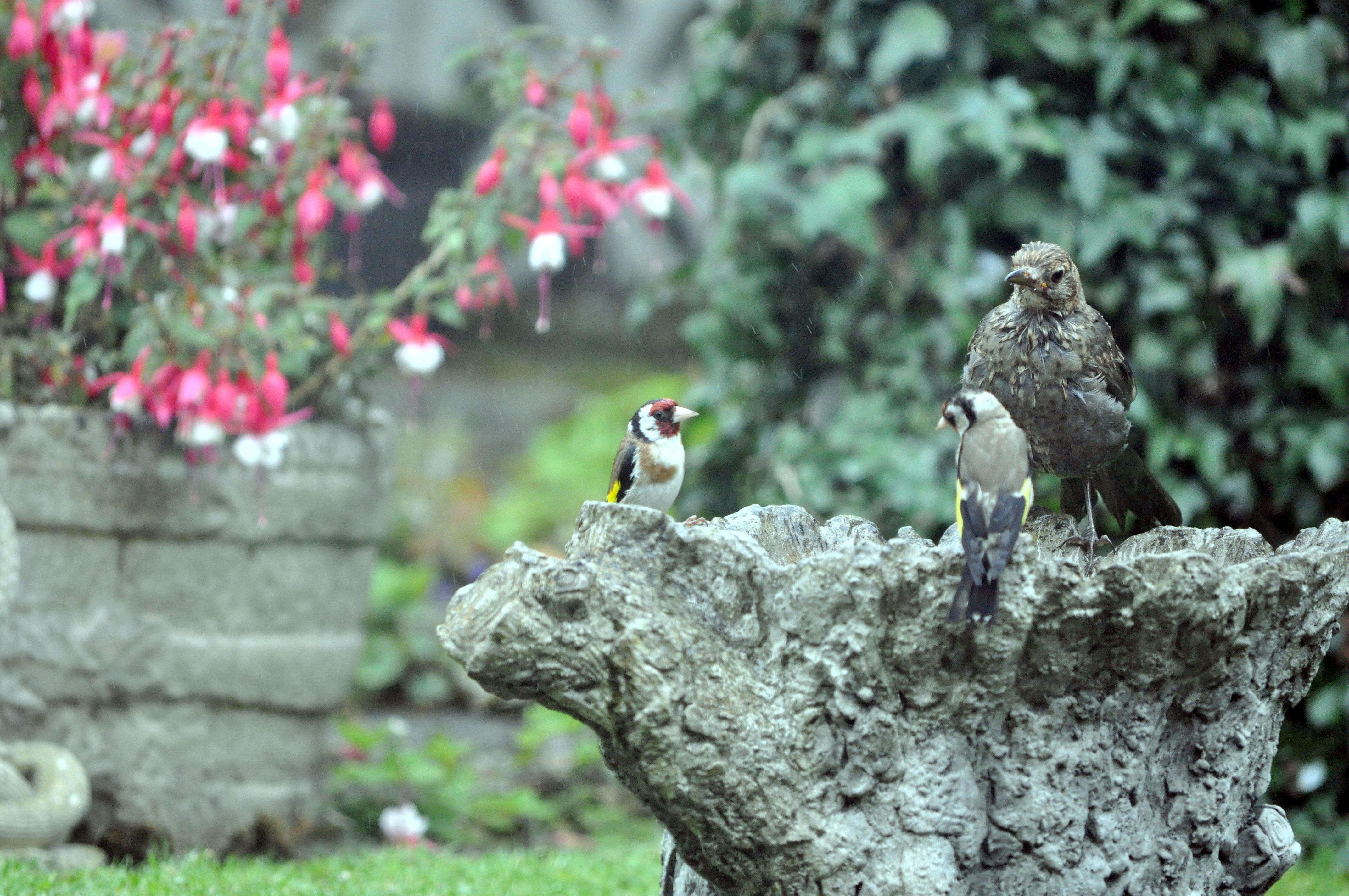 Blackbirds back again, determined to empty the birdbath along with Goldfinches.