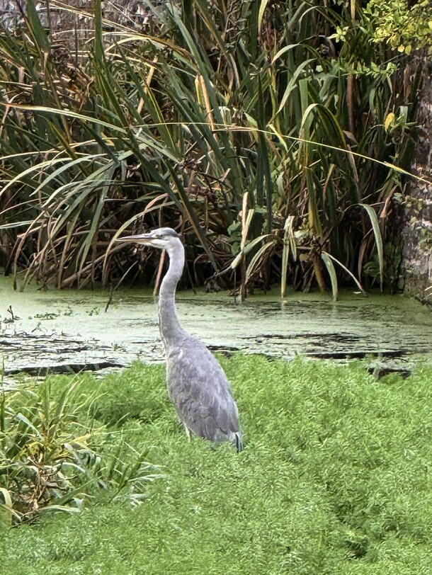 Grey Heron seen fishing in the very overgrown weeds in the Land Yeo which flows beside my garden.